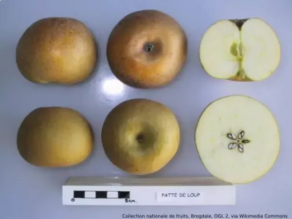 Patte-de-Loup semble originaire de la commune de Beaupréau dans le Maine-et-Loire, cette pomme est connue depuis le Moyen Age et aurait été, selon la légende, la variété préférée d’Anne de Bretagne. Ce pommier a été nommé d’après les marques distinctives sur la peau des fruits, ressemblant à des griffures de loup, ce qui a contribué à son nom unique et mémorable.